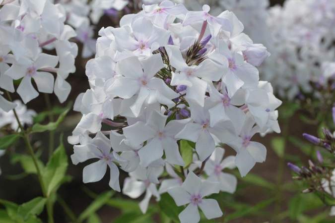Флокс Морская Пена. Цветки звёздчатые, диаметром 4,2 см, белые с лёгкими голубыми тенями и узкими закрученными лепестками. Бутоны голубые. Соцветия округло-конические, большие и пышные. Средний срок цветения. Куст раскидистый, но прочный, высотой 70-80 см. Хорош и оригинален!