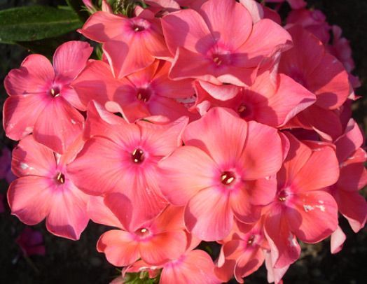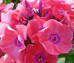 Флокс Московская Сказка. Цветок красновато-оранжевый, 3,5-4 см в диаметре, среднего тона, с малиновым колечком, слегка выгорает. Соцветие округло-коническое, большое, плотное. Куст рыхлый. Зимостойкий, устойчив к грибным болезням. Высота 60-80 см. Срок цветения средний.