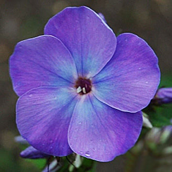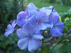 Флокс Моя Любовь, Моя Отрада. Сиренево-голубоватый на солнце, в пасмурную погоду и в сумерках ярко синеющий. Цветки колесовидные. Соцветие крупное, стебли прочные, скорость разрастания средняя. Требователен к условиям выращивания.
