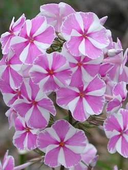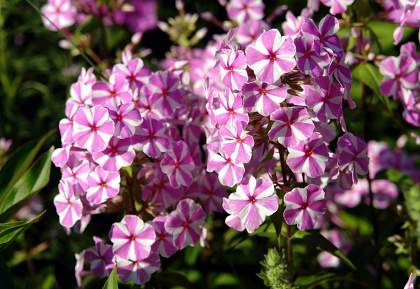 Флокс Natascha (Наташа). Цветки полосатые, лавандово-розовые с белым. Соцветия плотные, пирамидальные, длиной 15-30 см. Устойчивость к мучнистой росе высокая.