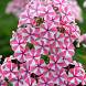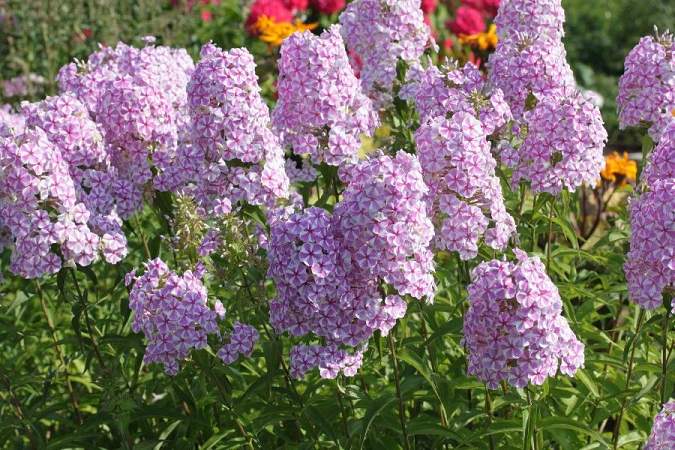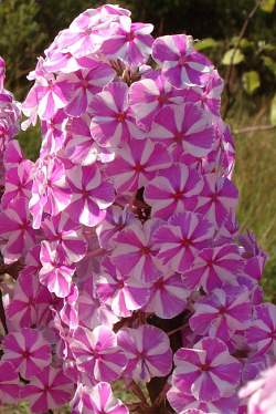 Флокс пятнистый Наташа. У нас в советские времена был сорт "Соната", а "Наташа" — это уже название, данное "Сонате" в Голландии. Бывает и так — не всегда мы умеем защитить свои достижения. А этот сорт — действительно достижение: отличная окраска, форма соцветия, не бывает реверсов, то есть побегов с другой окраской цветков, что для сортов с подобной окраской обычное дело. Цветы белые с розовой полосой вдоль центра каждого лепестка.