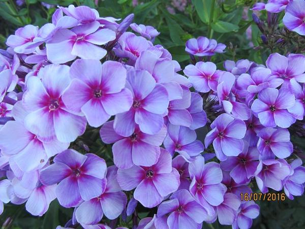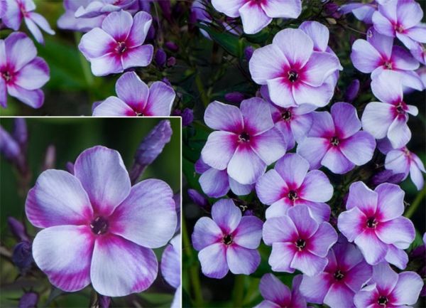 По мере отрастания побегов окраска листьев приобретает типичный для сорта зеленый цвет. Цветок флокса всегда состоит из пяти лепестков и имеет разнообразную форму и окраску — от чисто-белой до чернильно-фиолетовой и темно-вишневой. Часто в окраске присутствуют разнообразные тени, мазки, дымка, пятна, глазки, колечки и др. Размер венчика цветка может быть от 0,5 до 5,5 и более см. Цветки собраны в соцветие — метелку, которая у садовых флоксов имеет различную форму.