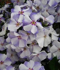 Флокс Новинка. Белый с голубыми тенями, в центре синеватые точки с малиновым оттенком, бутоны голубые. Лепестки волнистые. Цветение необыкновенно продолжительное, позднее. Лидер популярности!