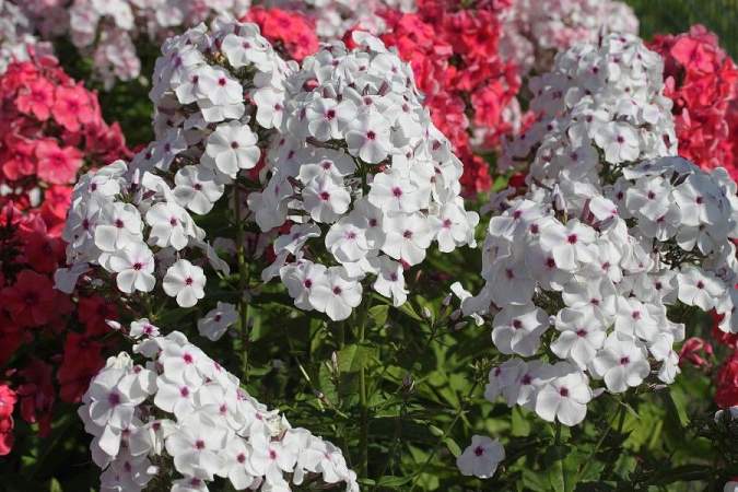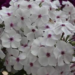 Флокс Очаровательные Глазки. Цветок размером 3,5 см. Высота куста 70-80 см. Цветки, звёздчатые, белые с фиолетово-пурпурной трубкой и такого же цвета маленьким глазком. Соцветие очень плотное, округло-коническое. Куст компактный, отлично зимует и нарастает.