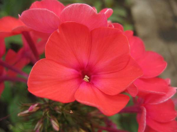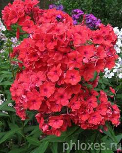 Флокс Одиль. Ярко-красный с маленькой вишневой звездочкой. Не выгорает. Края лепестков слегка загнуты вверх. Соцветие очень крупное, плотное, разветвленное, эффектное. Стебли прочные, куст слегка раскидистый. Не выгорает.