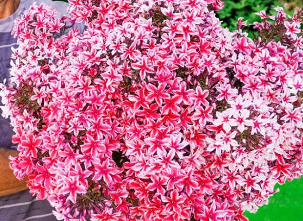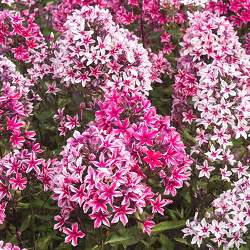 Флокс Palmyra (Пальмира). Необычная новинка. Цветки звездчатые, окрашенные по-разному в зависимости от возраста. Раскрываются как красные звезды с белой каймой, затем выцветают и становятся почти белыми с красным глазком. На одном соцветии встречаются цветки разной окраски, что создает праздничное и яркое зрелище.