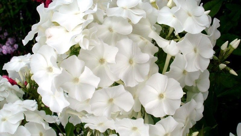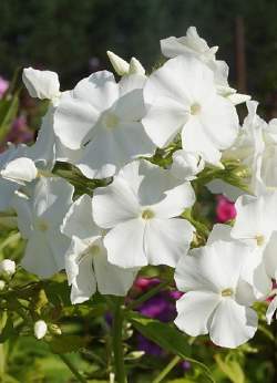 Флокс Panama (Панама). Высота растения 70 см. Куст сильный, многостебельный, раскидистый, быстро разрастается. Соцветие округло-коническое, среднего размера и плотности. Цветок белый, чистого тона, диаметром 3,5 см. Венчик колесовидный со слегка волнистыми лепестками.