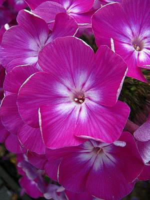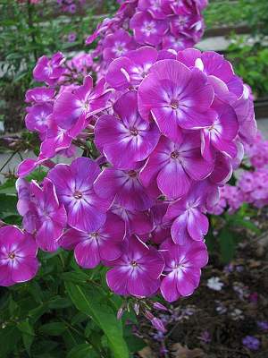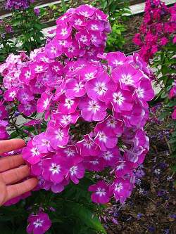 Флокс Песняры. Цветок колесовидной формы, малиново-пурпурный с яркой белой звездой, диаметром 4,2-4,5 см. При вечернем освещении и в пасмурную погоду эффектно меняет пурпурные оттенки на лиловые. Не выгорает, устойчив к росе и дождю. Соцветие большое, округло-коническое, красиво сложенное, плотное. Куст прочный, мощный, зимостойкий, быстро разрастается, устойчив к заболеваниям. Высота 75-80 см. Цветение обильное и продолжительное, в средние сроки.