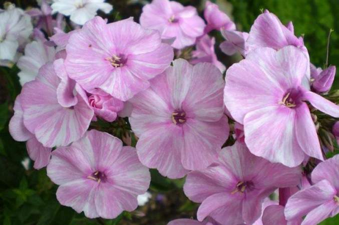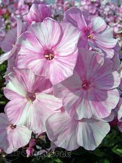 Флокс Picasso (Пикассо). С оригинальными пестрыми бело-розовыми цветками, диаметром 4 см, собранными в плотные соцветия. Высота флокса — 45-55 см.