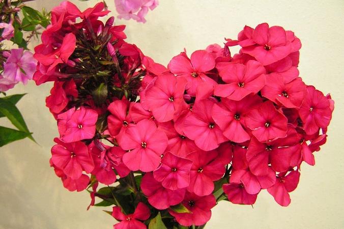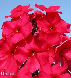 Флокс Пламя. Цветки 4 см. Высота 80 см. Срок цветения средний. Тёмно-карминно-красный, ровный, совершенно не выгорает. Соцветие плотное. Лист тёмно-зелёный, плотный. Куст стройный, прочный. Один из лучших красных сортов. Нарастает медленно.
