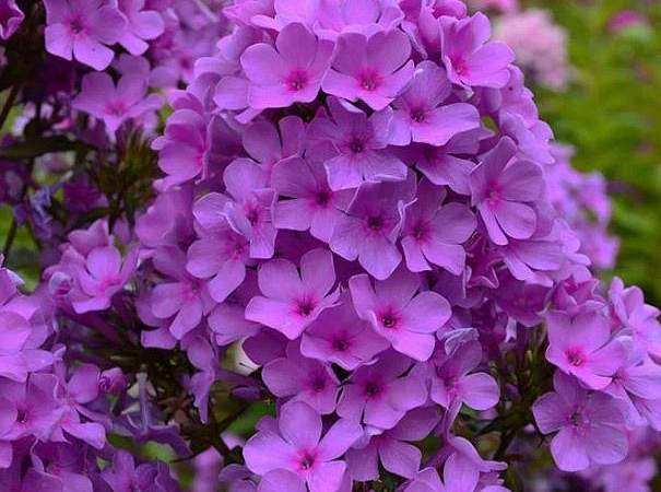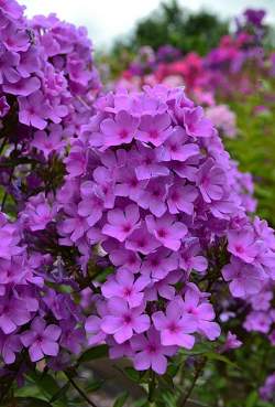 Флокс Плюш Сиреневый. Мелкоцветковый. Обладает ровной сиреневой (с розовинкой) окраской, в центре горит крошечный, но яркий пурпурный глазок. Чашевидная форма цветка придает овально- или округло-коническим соцветиям рельефность, при этом лепестки этих цветков-"звездочек" не перекрываются. Куст достигает 90-100 см в высоту. Флокс среднего срока цветения, длится оно долго.