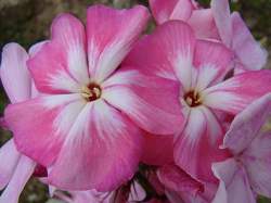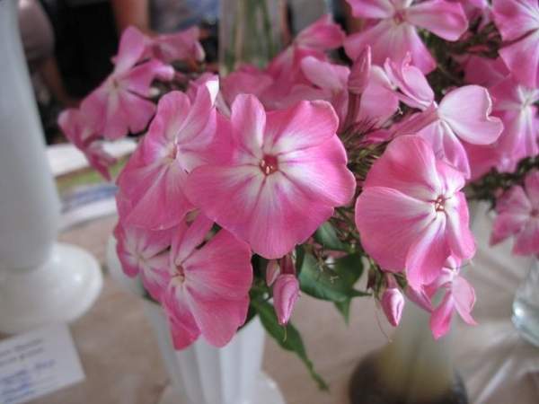 Флокс Поэма. Цветок колесовидный, несмотря на крупный размер, хорошо держит форму. Окраска — теплая розовая с размытой белой звездочкой в центре. Соцветие среднее. Куст слегка разваливается.