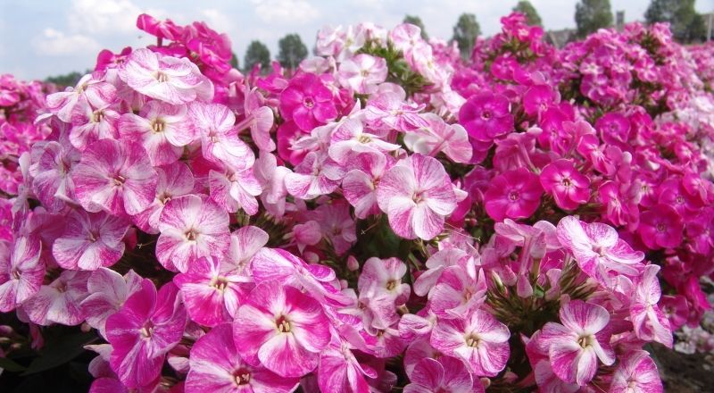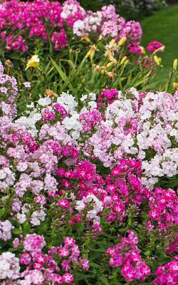 Флокс Potpourie (Попурри). Компактный сорт, особенно хорошо подходит для выращивания в контейнерах. Цветки диаметром 3,5 см, белые с тёмно-розовыми или малиновыми штрихами, изменчивые, каждый день окрашиваются в различные оттенки малинового. Иногда некоторые ответвления могут иметь чисто-белые или розово-малиновые цветки.