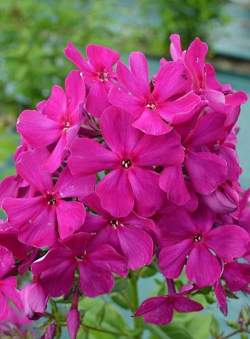 Флокс Пурпурная малышка. Цветки диаметром 4 см, звёздчатые, ярко-пурпурные, не выгорают. Соцветие овально-коническое. Высота 50-60 см. Срок цветения средний.