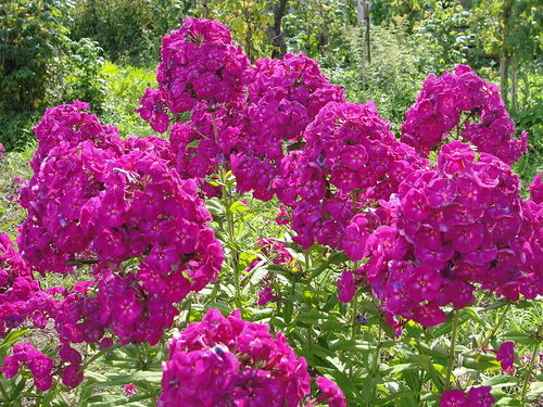 Флокс Пурпурный Бархат. Цветок насыщенно-пурпурный с небольшим посветлением в центре, колесовидной формы. Лепестки бархатистой текстуры. Соцветие плотное, округлое, очень крупное. Хорошо переносит дождь.