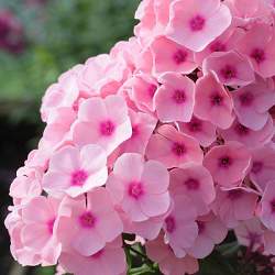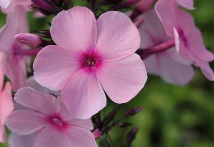 Флокс Радомир. Розовый с палевым оттенком, уникального тёплого тона, с малиновым колечком. Диаметр цветка 3,8-4 см. Соцветие большое, округло-коническое, плотное. Куст высокий — 100 см, прочный, но иногда требуется подвязка.