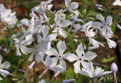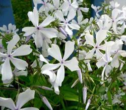 Флокс White Perfume (Уайт Пёфьюм). Листья зелёные, блестящие. Бутоны слегка голубоватые. Цветки белые, с лёгкой голубизной. Цветение бывает настолько сильным, что листья не просматриваются под облаком цветов. Абсолютно неприхотлив, может использоваться для создания зарослей в полутени. Очень сильный и стабильный по всем параметрам сорт. Высота растения 35-40 см.