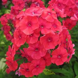 Флокс Red Riding Hood (Ред Райдинг Худ). Травянистый многолетник высотой до 70 см. Цветки очень яркие, красно-малиновые, собраны в овально — конические соцветия. Соцветие плотное, не выгорает. Листья зеленые, блестящие. Цветет в июле — августе. Хорошо растет на солнечных или частично затененных прохладных местах. При сильной жаре растения притеняют. Предпочитает среднесуглинистые, плодородные, рыхлые почвы с небольшим уклоном для стока воды или хорошим дренажем. Зимует без укрытия, устойчив к вредителям и болезням.