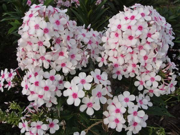 Флокс Рубиновая Капля. Цветки диаметром 2,5-2,8 см, белые с ярко-розовыми глазками. Соцветия овально-конические, плотные, пышные. Кусты крепкие, высотой 70-80 см. Сорт яркий, среднего срока цветения.