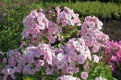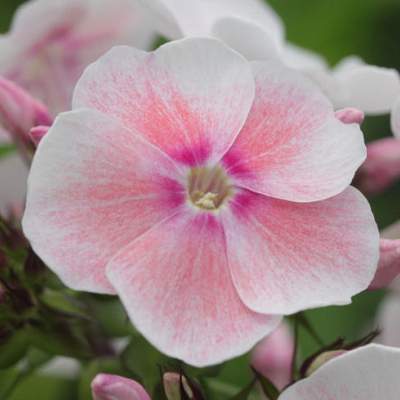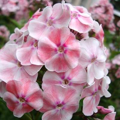 Флокс Румянец Девушки. Светлый, на белых лепестках широкие розовые, теплого оттенка, мазки. Лепестки волнистые, соцветия достаточно крупные, нарядные. Куст требует подвязки. В жару окраска блекнет. Цветение длительное и обильное.