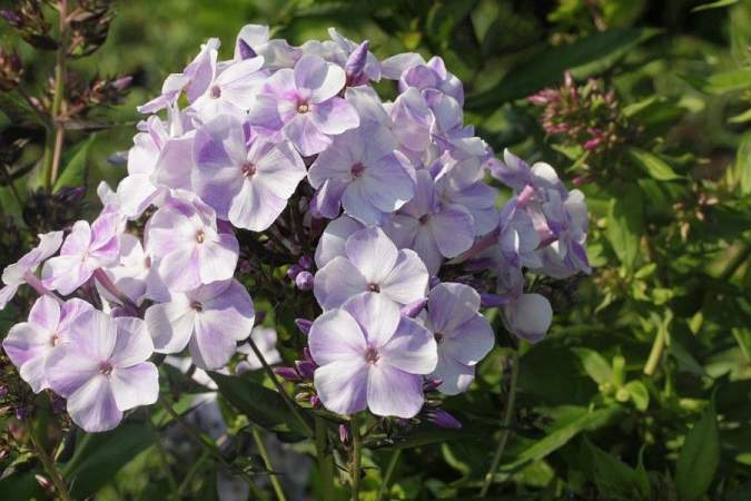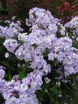 Флокс Северное Облако. Ранний сорт, цветки светло голубовато-сиреневые с малиновым кольцом диаметром 3,2 см, соцветие плоскоокруглое диаметром 25 см, куст высотой в первый год 40 см, на второй год достигает высоты 80 см.