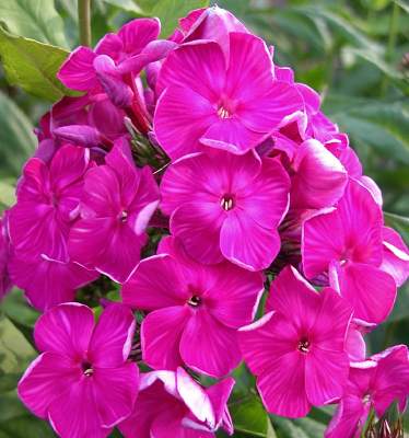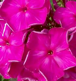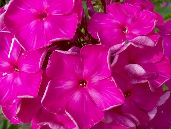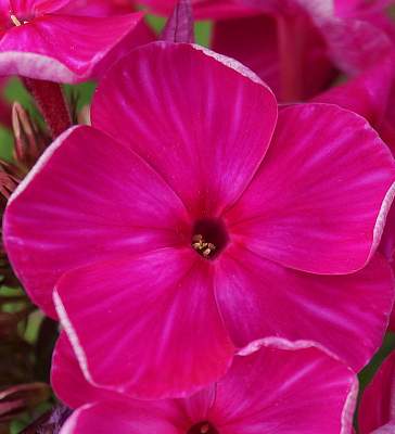 Флокс Шансон. Эффектный крупноцветковый сорт. Цветки пурпурные с красивой штриховкой. Края лепестков слегка загнуты внутрь, так что видна светлая подкладка.