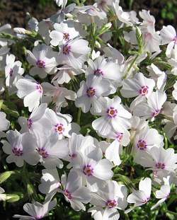 Флокс Amazing Grace (Эмейзинг Грейс). Цветки белые с размытым пурпурным колечком. Образует вечнозелёные ковры. Разрастается хорошо. После цветения желательно сократить толщину дернинки на 5-8 см. Это позволит избежать израстания и оголения.