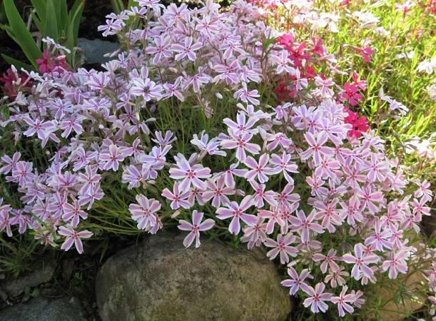 Хотя цветки у стелющихся флоксов мелкие, цветут они очень обильно. Под сплошным покровом цветов совершенно не видно зелени и длится это около месяца. При благоприятных условиях может наступить повторное цветение.