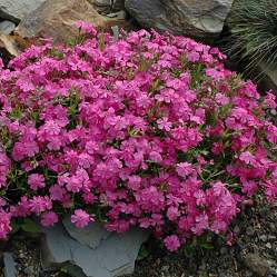 Флокс шиловидный Samson (Самсон). Высота куртины растения 5-10 см, в цвету до 15 см. Лежачие стебли с очень короткими междоузлиями сплошь покрыты тесно сидящими узкими листьями. Стебли заканчиваются цветоносами. Цветки диаметром около 2,5 см собраны по 5-7 шт. в небольшие соцветия. Венчик с раздвинутыми, выемчатыми по краям лепестками.