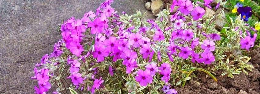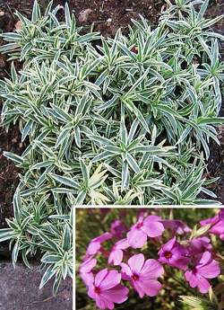Флокс шиловидный Variegata (Вариегата) Многолетнее, почвопокровное растение. Листья тёмно-зелёные с беловато-розовой каймой, на солнце кайма становится ярко-розовой. Цветки розовые, 1-1,5 см в диаметре, собраны в зонтиковидное, рыхлое соцветие. Цветет супер обильно.