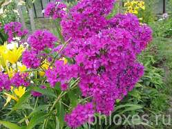 Флокс Сирень Пурпурная. Цветки диаметром 1,5 см., сиренево-пурпурные, в сумерках пурпурно-фиолетовые, звёздчатые с разделёнными и слегка приподнятыми вверх лепестками. Соцветия пышные. Кусты высотой 90-100 см.