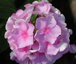 Очень крупные чашевидные сиренево-розовые цветки с оранжево-розовым колечком, колесовидной формы. Края лепестков слегка приподняты вверх Соцветие большое плотное. Стебли прочные. Куст скорее раскидистый, крупные листья. Нарастает умеренно. Победитель многих выставок.