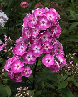 Флокс Смешинки. Диаметр 3,6 см, высота 70-80 см, среднепоздний. Веселая жизнерадостная расцветка — светло-пурпурная с большим белым центром. Цветки колесовидные. Соцветия цилиндрические или дробно-конические. Компактный крепкий куст не требует подвязки.