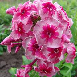 Флокс Stars and Stripes (Старс энд Страйпс) стал популярен благодаря запоминающемуся рисунку в виде звезды малинового цвета в центре цветка, от которой отходят прямые серебристые штрихи, края же лепестков имеют нежный розово-малиновый оттенок.