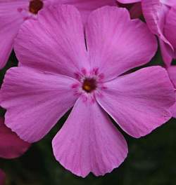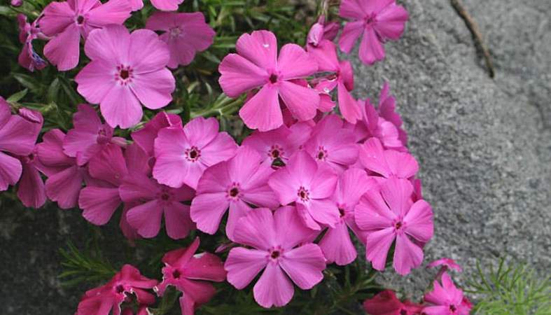 Флокс Rosea (Розеа). Гибрид между шиловидным и побегоносным флоксами. Образует ковер высотой 10-15 см и до 40 см в диаметре. Листья небольшие, ланцетные. Цветы малиново-сиреневые, пятилепестковые. Возможно повторное цветение с конца сентября до октября. Предпочитает солнечное местоположение и бедные почвы. Цветки довольно крупные для почвопокровных флоксов.