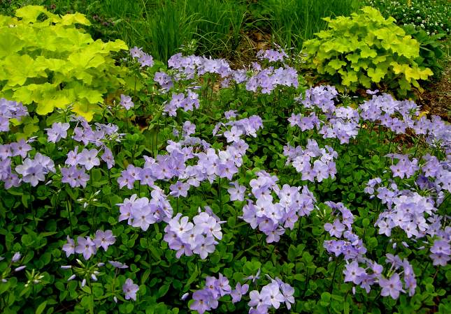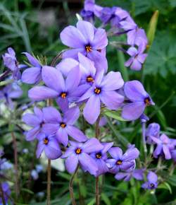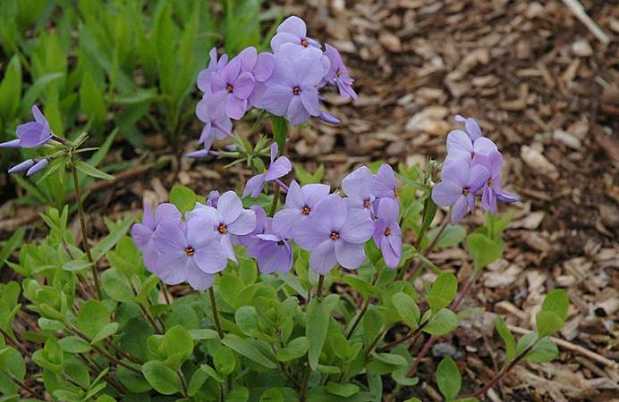 Флокс Blue Ridge (Блу Ридж). Образует красивые зелёные дернинки, эффектные во время цветения. Многолетнее травянистое растение с ползучими побегами, покрытыми зимующими удлиненно-овальными опушенными листьями. Цветоносы прямостоячие, опушенные, с немногочисленными мелкими листьями. Цветки собраны на тонких коротких цветоножках в числе 5-10 штук на верхушках побегов. Высота в цвету 15-20 см. Нецветущая куртина не превышает в высоту 5 см. Образует очень густые ковровые заросли.