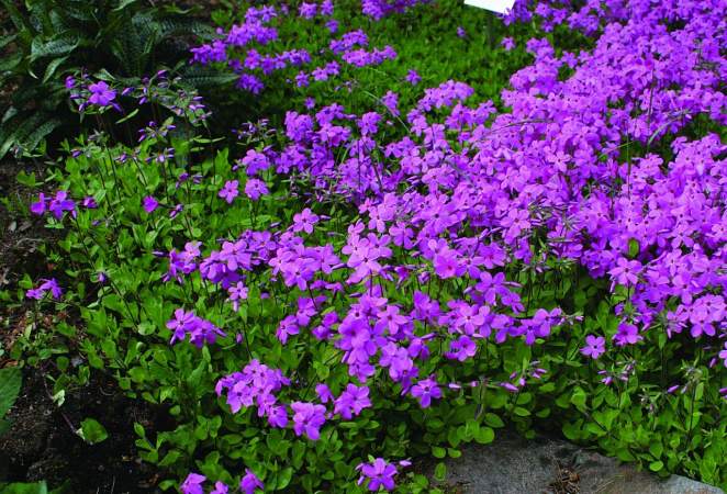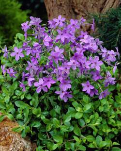 Флокс столононосный Purpurea (Пурпуреа). Образует красивые зелёные дернинки, эффектные во время цветения. Цветки розово-лиловые. Образует дернинки, постепенно, расползающиеся с помощью коротких, легко укореняющихся побегов. В полутени они более рыхлые, на солнце очень плотные и цветение обильнее. Цветки в пышных шапках щитковидных соцветий. У нас пока ещё редкий вид.