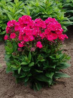 Флокс Strawberry Daiquiri (Строберри Дайкири). Цветки тёмно-красные с перекрывающимися лепестками. Соцветия плотные. Цветение обильное. Листья тёмно-зелёные. Куст крепкий, компактный, высотой 40-50 см. Устойчив к мучнистой росе.