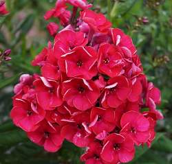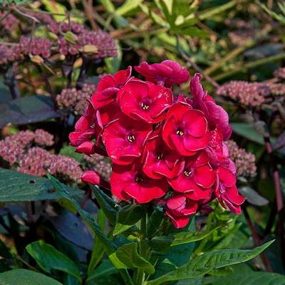 Флокс Strawberry Daquiary (Строберри Дайкири). Цветки интенсивно тёмно-красные с перекрывающимися лепестками. Соцветия плотные. Цветение обильное. Листья тёмно-зелёные. Куст крепкий, компактный, высотой 40-50 см. Устойчив к мучнистой росе.