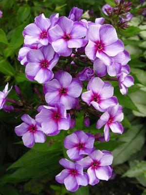 Флокс Swirley Birly (Свёли Бёли). Бело-фиолетовый с малиновым глазком, соцветие плотное, не выгорает, куст прочный, хорошо разрастается, цветение обильное. Высота 60 см.