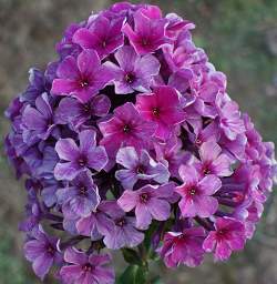 Флокс Титаник. Цветки средней величины (до 3 см), пурпурно-фиолетовые с серебристым и пепельным "туманом", аккуратной звездчатой формы, собраны в овально-конические, очень плотные соцветия. Куст крупный, до 100 см в высоту, пышный, очень красивый. Имеет высокую устойчивость к болезням. Срок цветения средне-поздний.