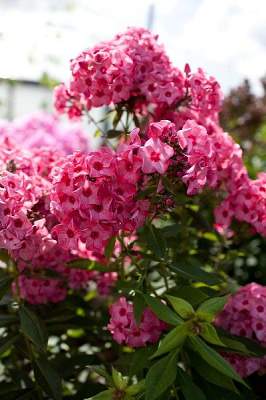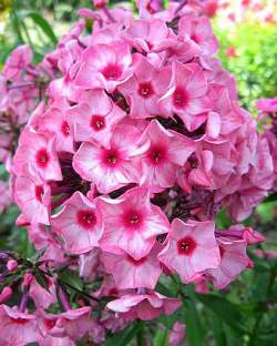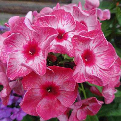 Флокс Уральские Сказы. Цветок размером 3,7 см. Высота куста 80-90 см. Дымчатый. Цветки тёмно-розовые с густой серебристо-белой штриховкой по краю лепестков и ярким малиновым колечком. По мере цветения серебристых теней всё больше, а розовый цвет остаётся только в виде продолговатых узких штрихов. Лепестки слегка приподняты, особенно сильно в жаркую погоду. Бутоны ярко-розовые. Очень красив, нарастает медленно.