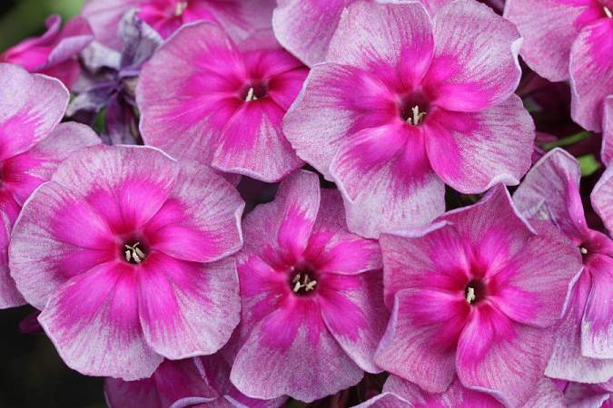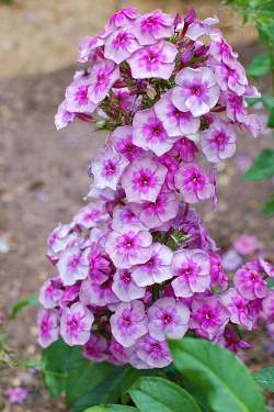 Флокс Венец. Сиренево-фиолетовый в момент роспуска, позднее по краям лепестка появляется серебристая дымка. Цветки колесовидные, характерной выпуклой формы. Соцветие очень большое, ветвистое, плотное, красивой формы. Стебли прочные, прямые. Куст сильный.
