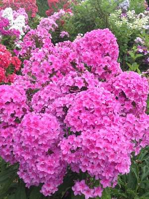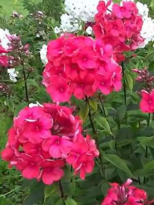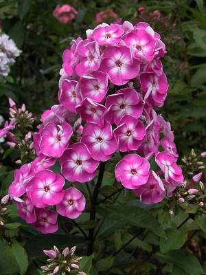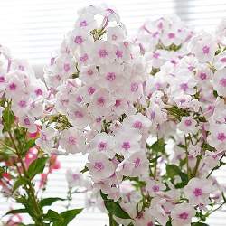 Флокс Весенний Сад. Светлый, воздушный, цветет обильно. Срок цветения ранний. Цветки 3,2 см, белые с красивой розовой звездочкой в центре. Соцветия удлиненные, плотные. Листья светлые. Высота 75 см.