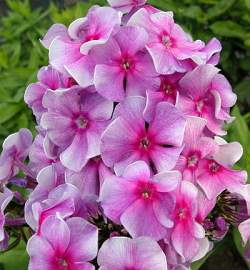 Флокс Виринея. Растение высотой 75-80 см, диаметром 35 см. Куст прямостоячий, среднеоблиственный. Среднее число соцветий на одно растение в первый год 2-3 шт., во второй — 4-6, в третий — 8-18 шт. Цветонос прочный. Соцветие коническое с выступом (пирамидальное), высотой 20-25 см, диаметром 25 см, плотное, из 50-60-ти одновременно распустившихся цветков.