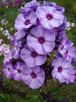 Флокс метельчатый Вий. Очень эффектный сорт с необычной окраской! Цветки диаметром 3,8 см, тёмно-сиреневые с более светлым сиреневым центром и ярким малиновым колечком, аккуратные, точеные. Соцветия большие, плотные. Кусты прочные, высотой около 100 см. Средне-поздний срок цветения.