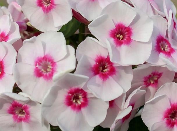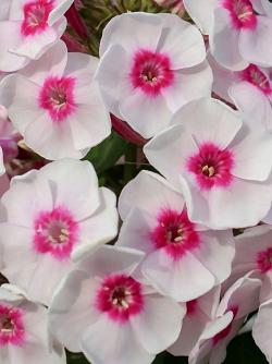 Флокс Younique Trendy (Юник Тренди). Компактный, хорошо разветвлённый, устойчивый к мучнистой росе, обильно цветущий сорт. Цветки белые с малиновым глазком. Соцветия пышные плотные. Цветение в июле-августе. Высота 40-60 см. Место солнечное. Почва влажная, дренированная.