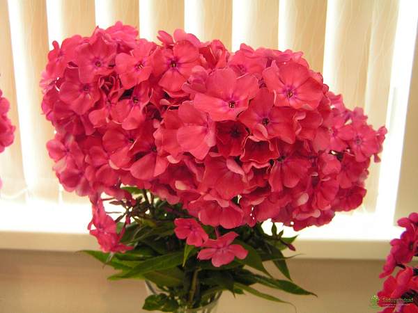 Флокс Юнат. Куст прямостоячий, сомкнутый, очень прочный, высотой 50-60 см, слабо разрастающийся. Лист темно-зеленый. Соцветие размером 35х25 см, округлое.