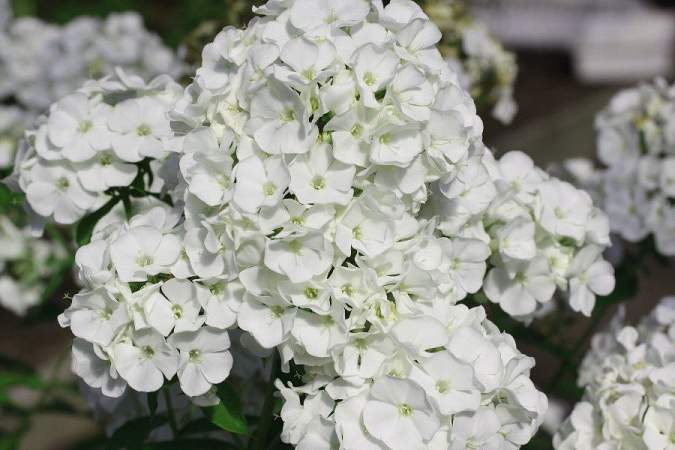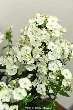Флокс Зеленая Бусинка. Цветки диаметром 2 см, белоснежные с зеленоватым горлом и зеленоватыми мазками по краям лепестков. Соцветия большие, плотные, хорошо сложенные из огромного количества маленьких округлых цветочков. Средний срок цветения. Кусты прочные с толстыми стеблями высотой до 90 см.