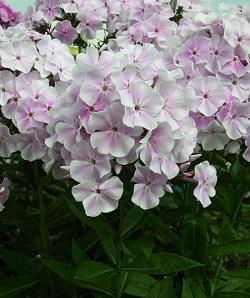 Флокс Зимнее Утро. Цветок блюдцевидный, белый с пурпурными тенями, к центру тени гуще, не выгорает. Соцветие округло-коническое, плотное, большое.